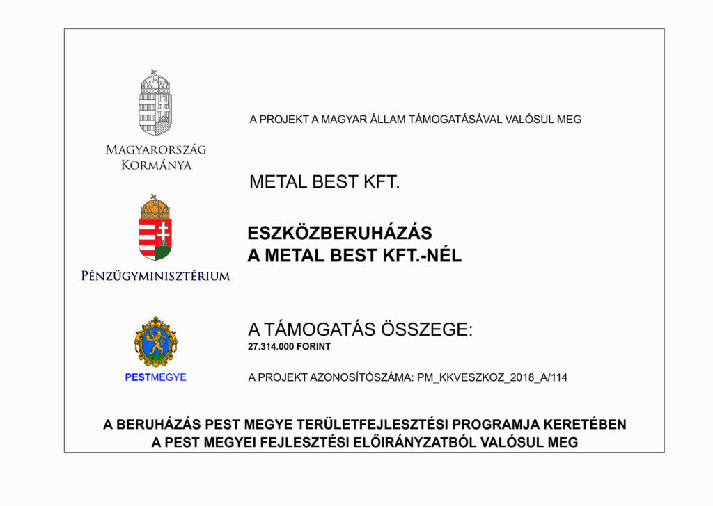 A Metal Best Kft. a GINOP PLUSZ-1.2.3-21 „A mikro-, kis- és középvállalkozások modern üzleti és termelési kihívásokhoz való alkalmazkodását segítő fejlesztések támogatása a leghátrányosabb helyzetű régiókban” című felhívás keretében 89,5 millió Ft feltételesen vissza nem térítendő európai uniós támogatást nyert el. A projekt összköltsége 179 millió Ft volt, fizikai befejezése 2023.12.31., azonosító száma: GINOP_PLUSZ-1.2.3-21-2022-04102.